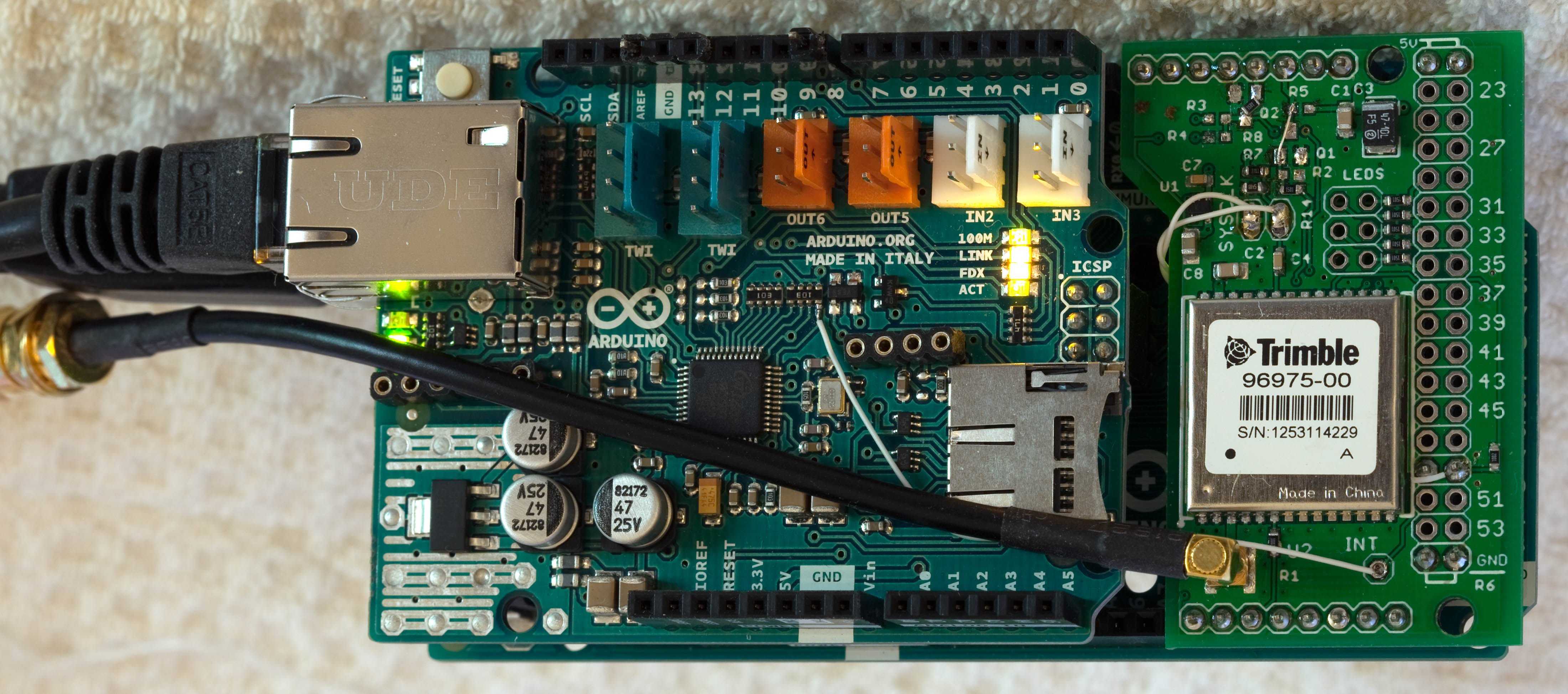 This is an advanced Arduino project and does require some modification of the Arduino boards. Two different GPS reference receivers are supported; the photo above depicts one of them -- the Trimble ICM SMT 360 timing receiver. This particular variant is easier to build using a custom PCB as shown in the photograph. The PCB uses 0603-sized SMT components and can be hand-assembled with a fine-tipped soldering iron and head-mounted magnifiers.